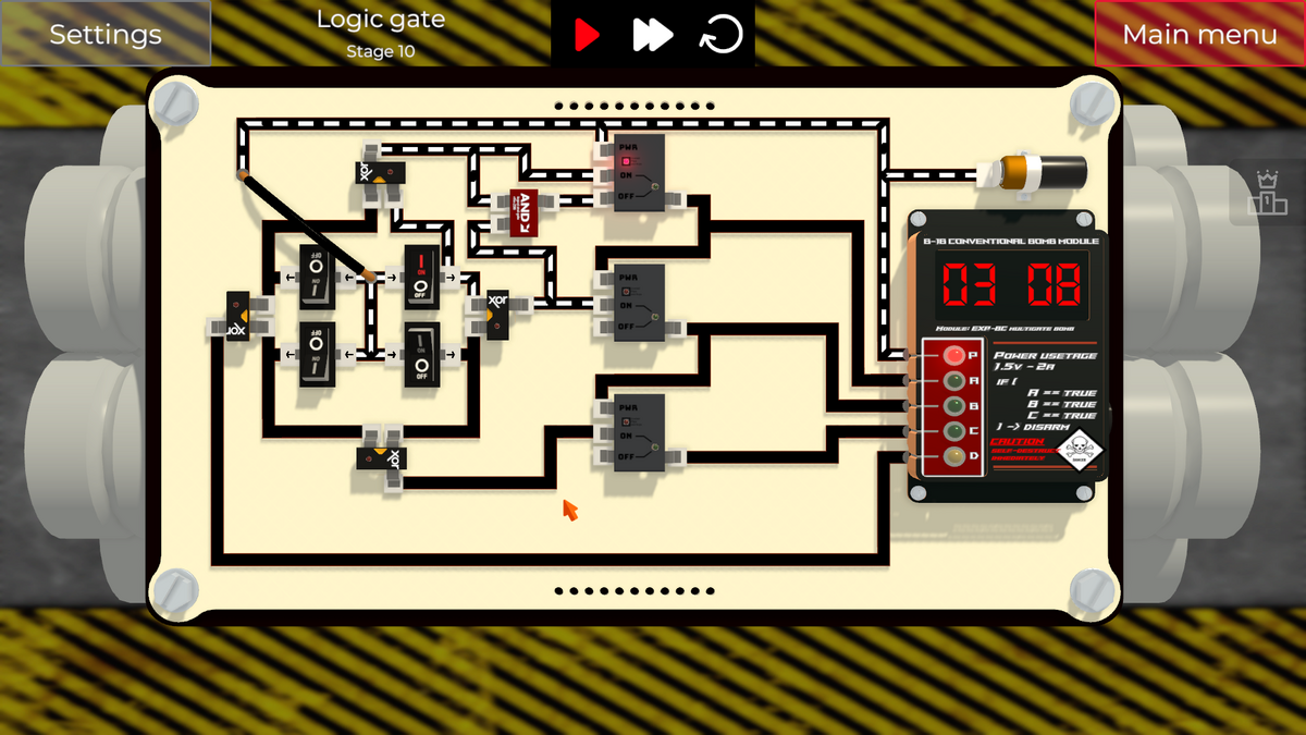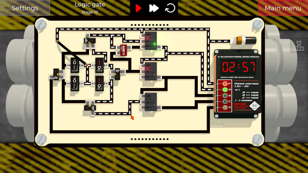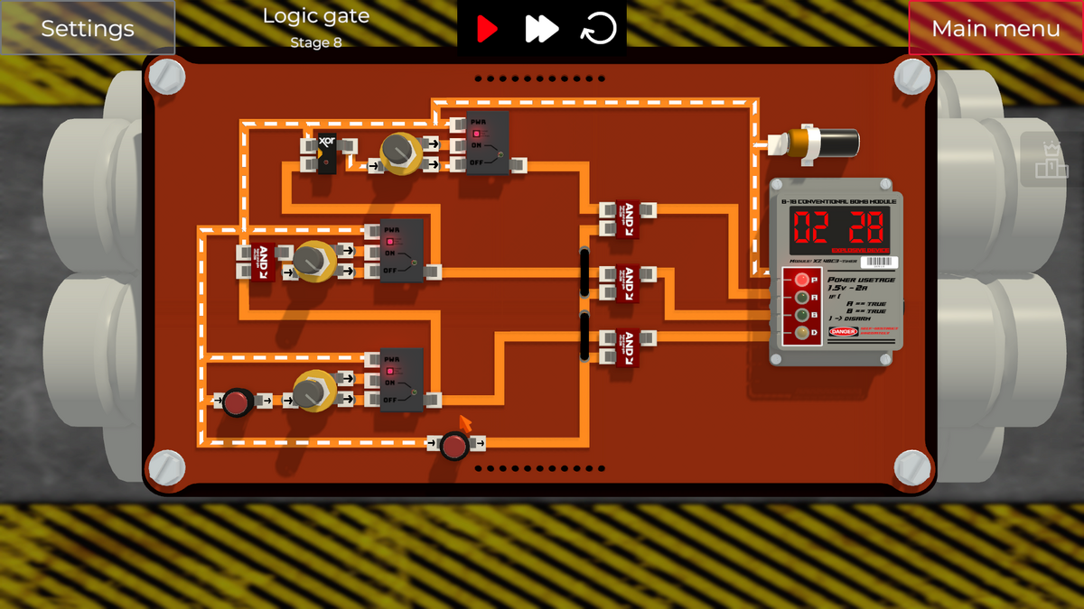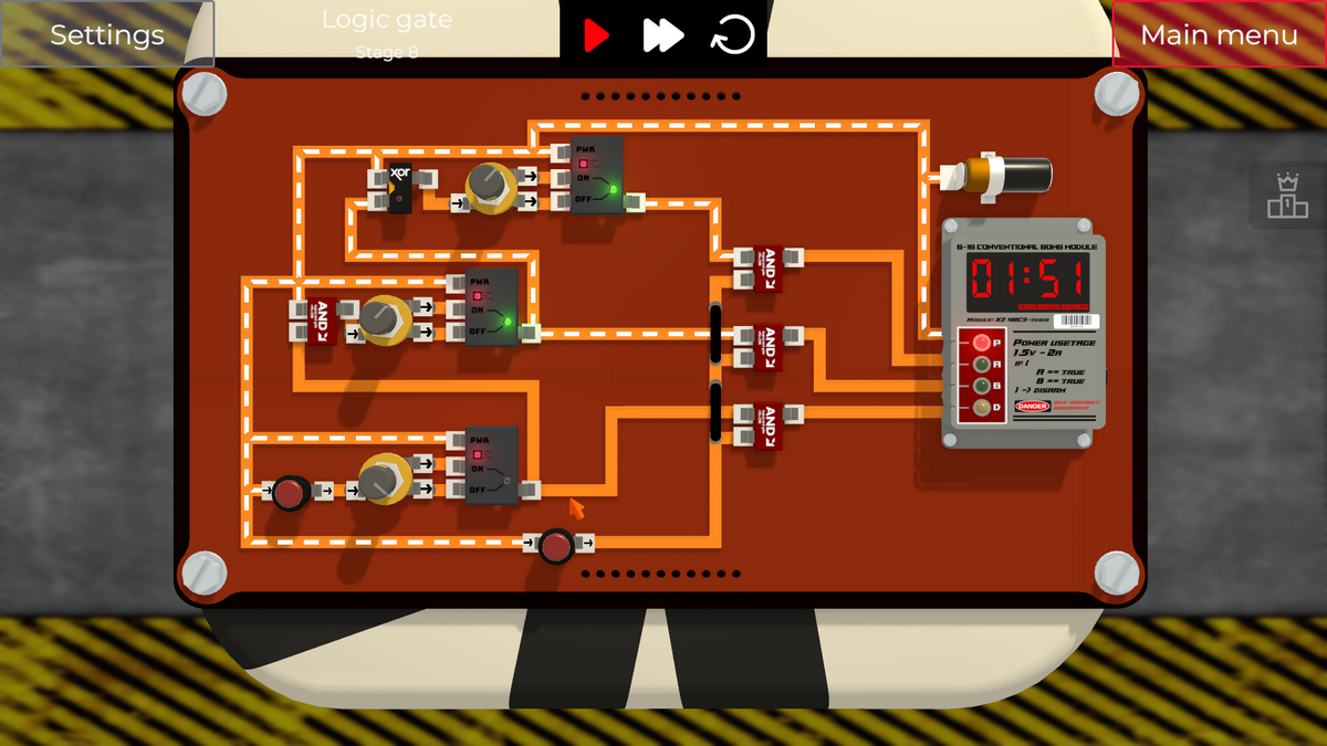 左側の2つのスイッチを切り替えると、XOR Gateの入力の片側がONになってしまい、即DETポートに通電され、爆弾が爆発してしまいます。
