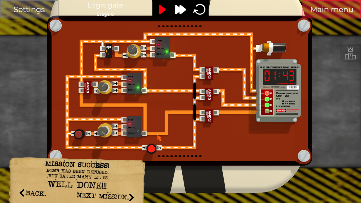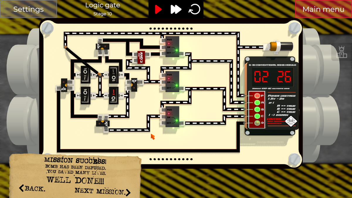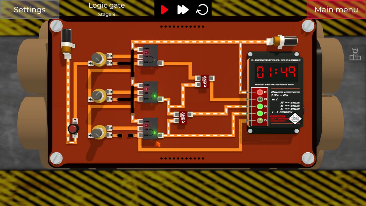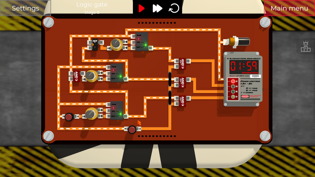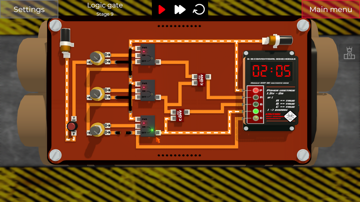 左側の2つのスイッチを切り替えると、XOR Gateの入力の片側がONになってしまい、即DETポートに通電され、爆弾が爆発してしまいます。