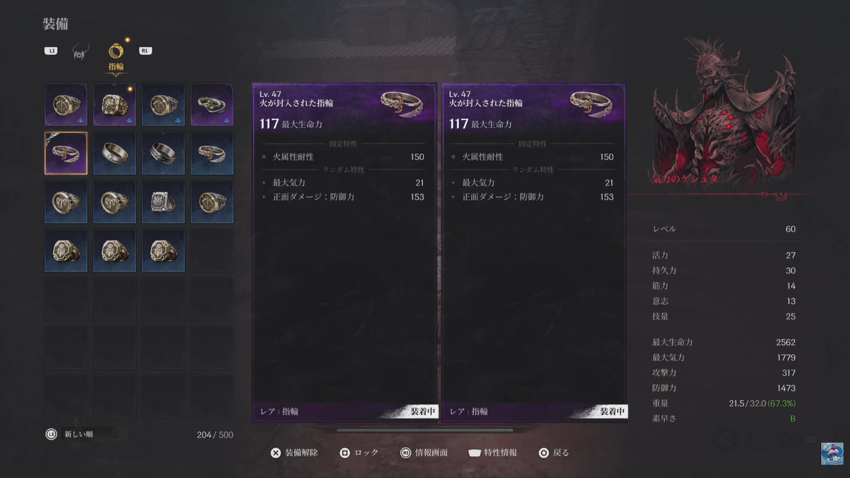 指輪やネックレスには、火耐性が+150となる特化アイテムもあるため、ここは多少防御力が落ちても、火耐性強化に装備を変更です。